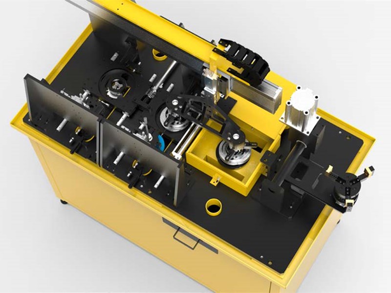 此測量工站由吹氣、內徑檢測、厚度檢測、移載機構等部分功能組成,機械手將產品放置在右側的翻轉夾爪上,翻轉臺將產品放置到吹氣盒中進行吹氣清潔,清潔完成后檢測機械手將產